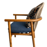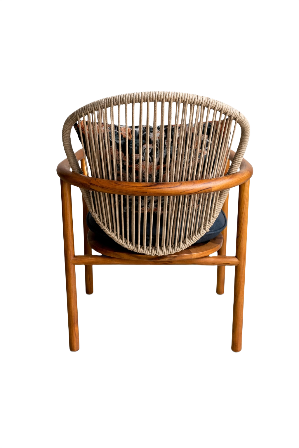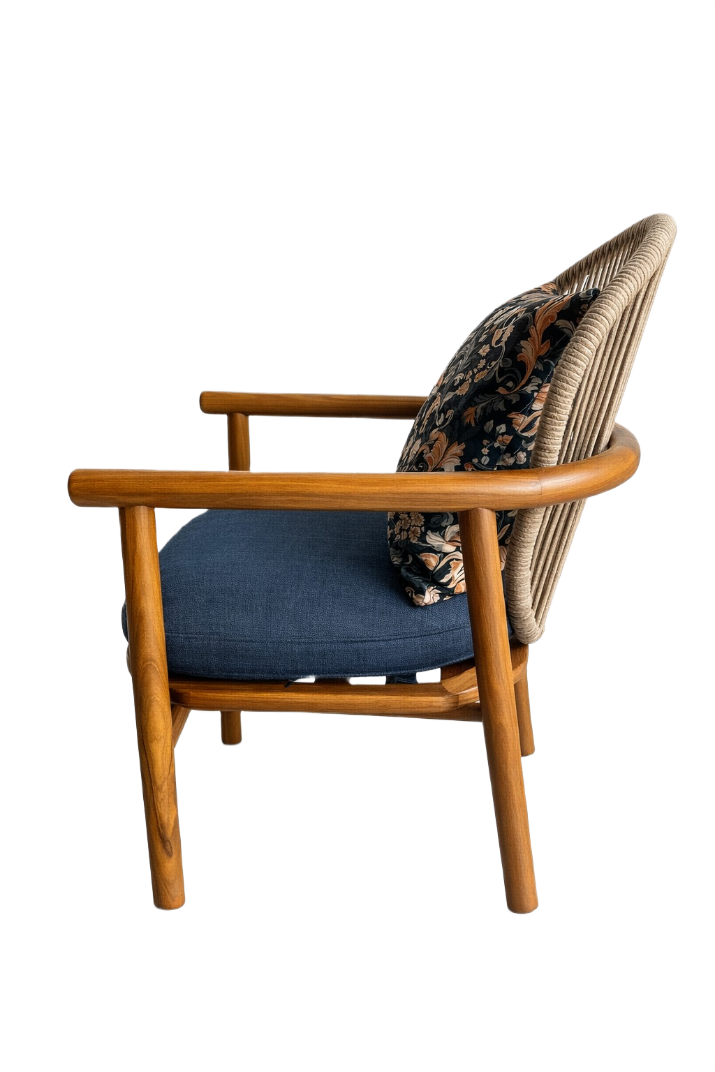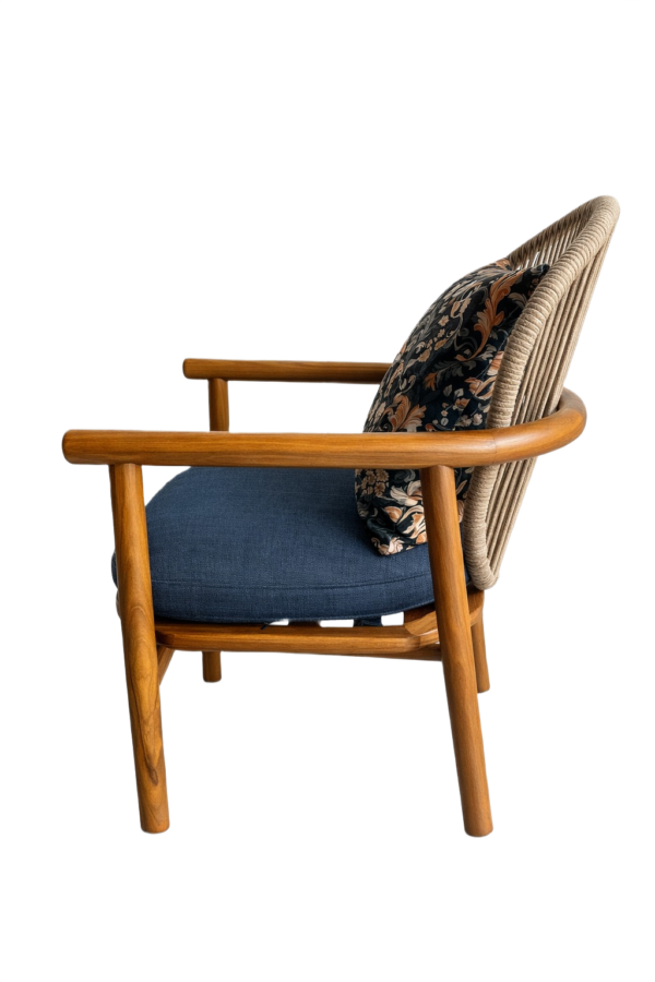 A relaxed outdoor lounge chair with a solid teak wood frame, oiled for durability, featuring an aluminum backrest wrapped in synthetic rope detailing. Complete with a removable upholstered seat cushion, matching back cushion, subtle stainless steel detailing, and protective glides for outdoor use.