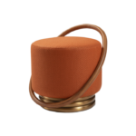 Fully upholstered pouf with a soft, textured fabric finish, featuring a wrapped solid wood accent and a circular base with SS electroplated detailing