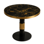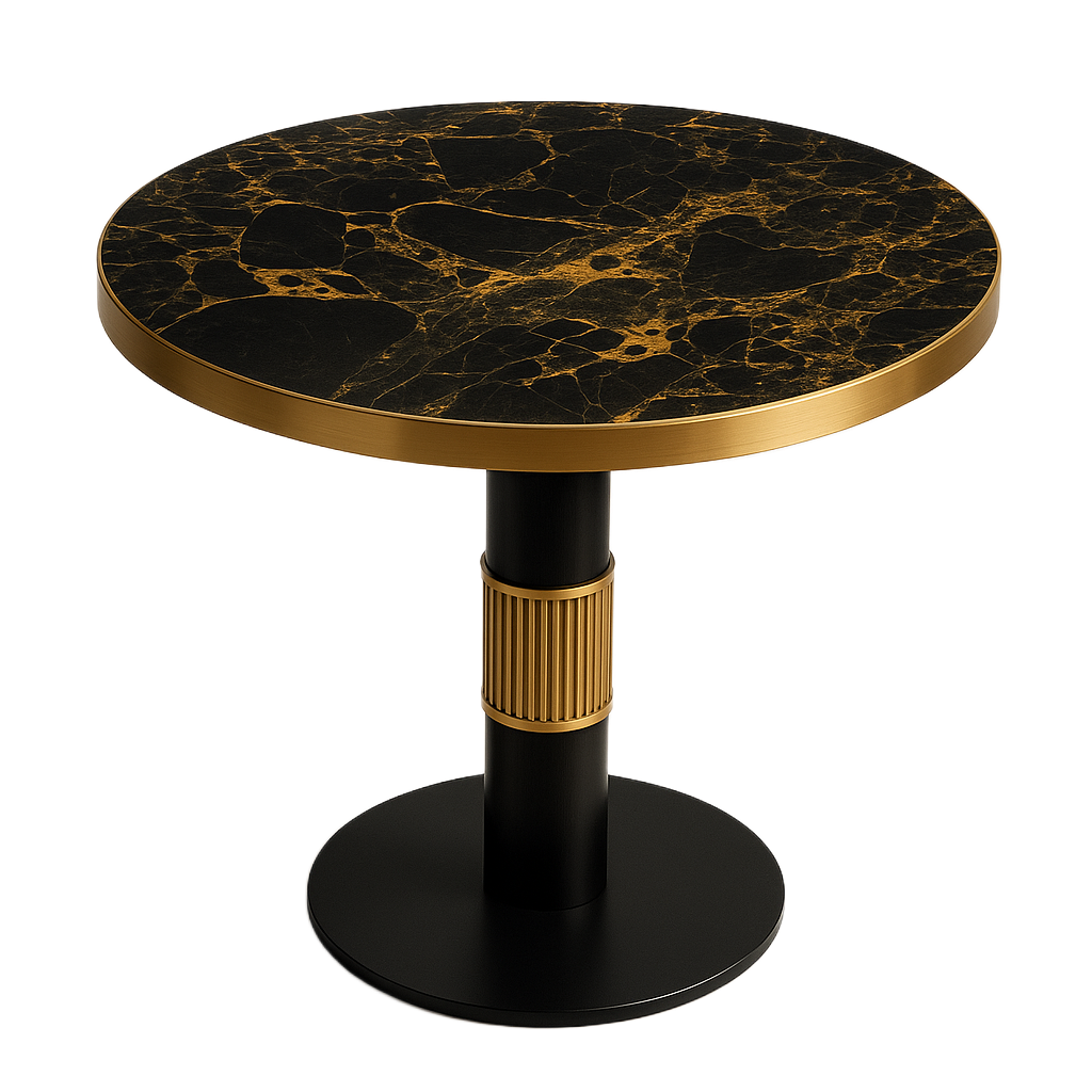 The tabletop is crafted in Golden Portoro marble with a straight-cut edge and stainless steel electroplated edging, finished at a 40 mm thickness. The column base is made from solid beech wood, stained and accented with stainless steel electroplated stride detailing at the center. A stainless steel powder-coated base plate provides stability, complete with adjustable glides for floor protection and leveling.