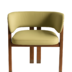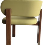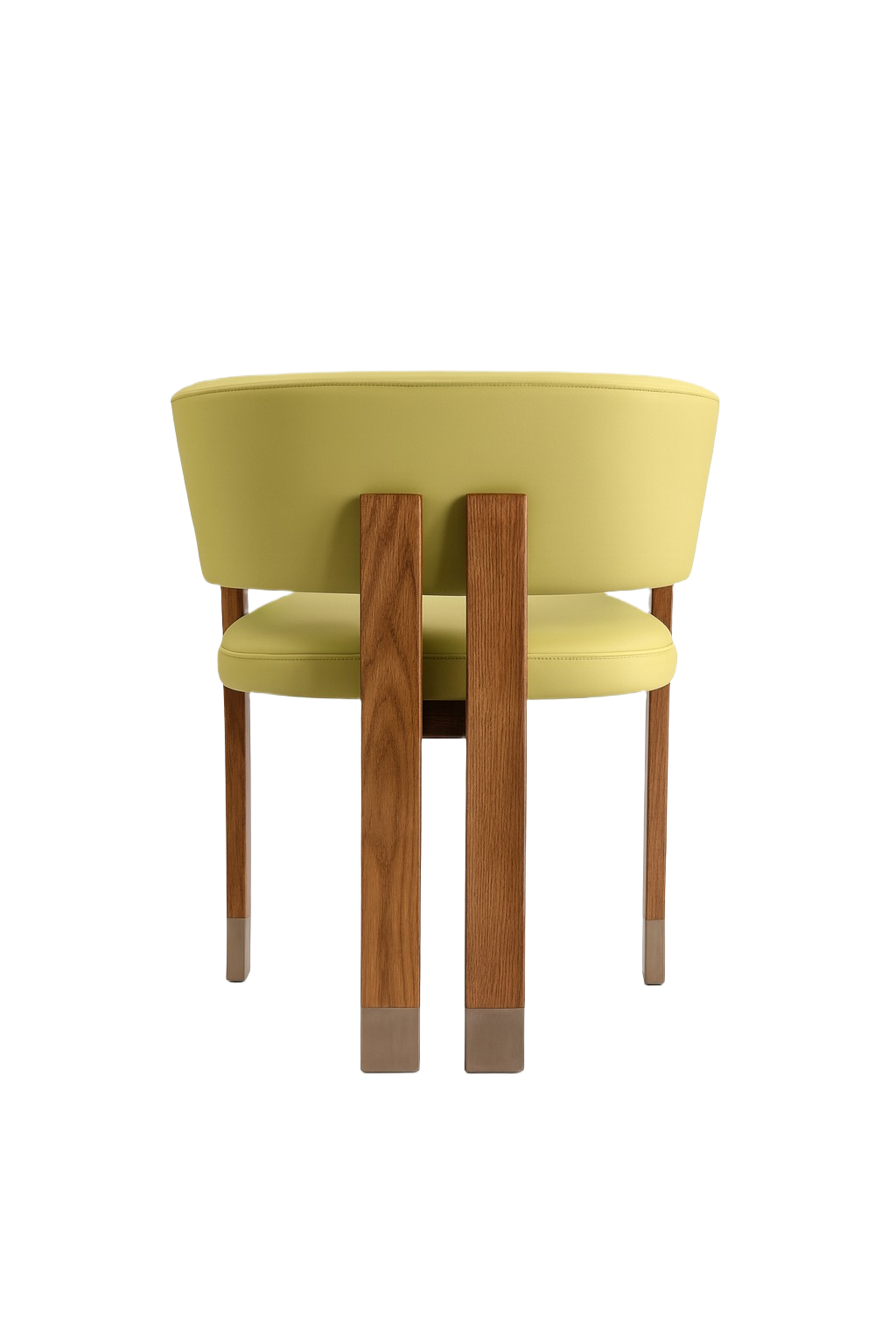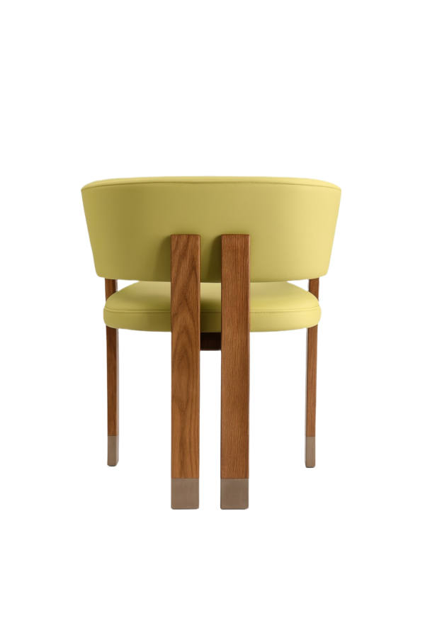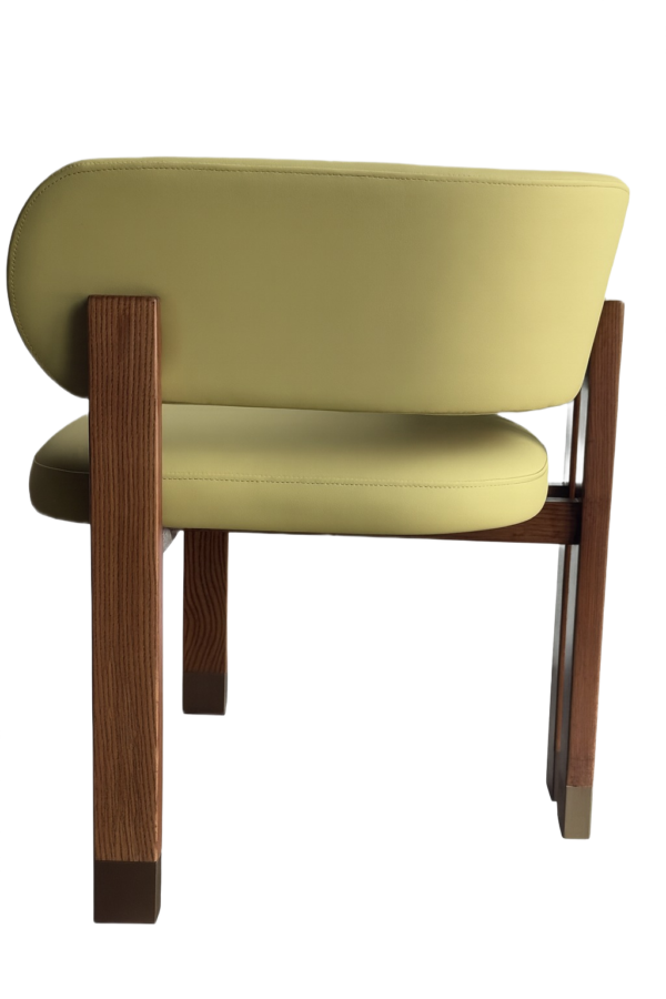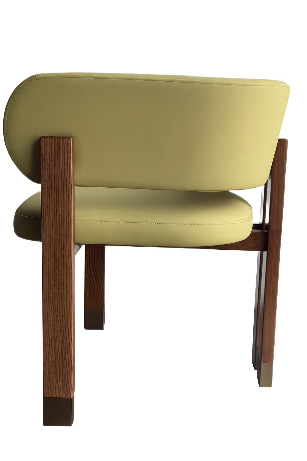 Solid ash wood frame in a walnut stain with an upholstered artificial leather seat and back. Leg ends finished in matte brass electroplated stainless steel.