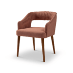 A fully upholstered dining chair with subtle piping detail, set on a stained solid American teak wood frame. Designed for comfort with a refined finish.