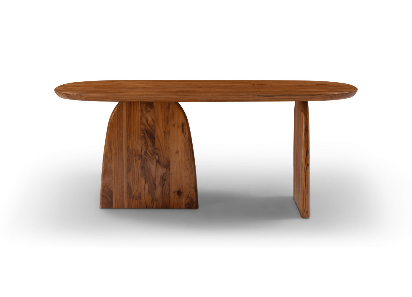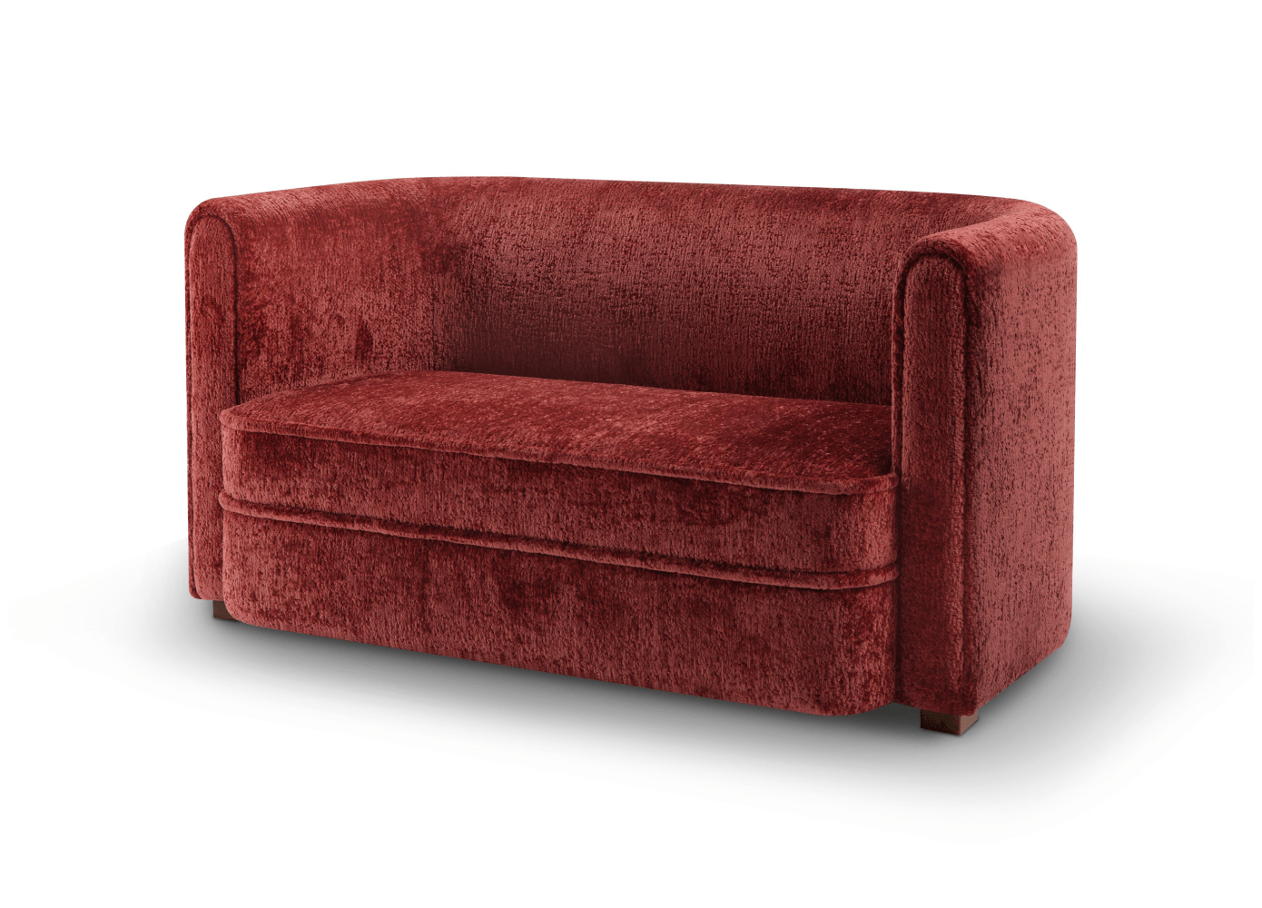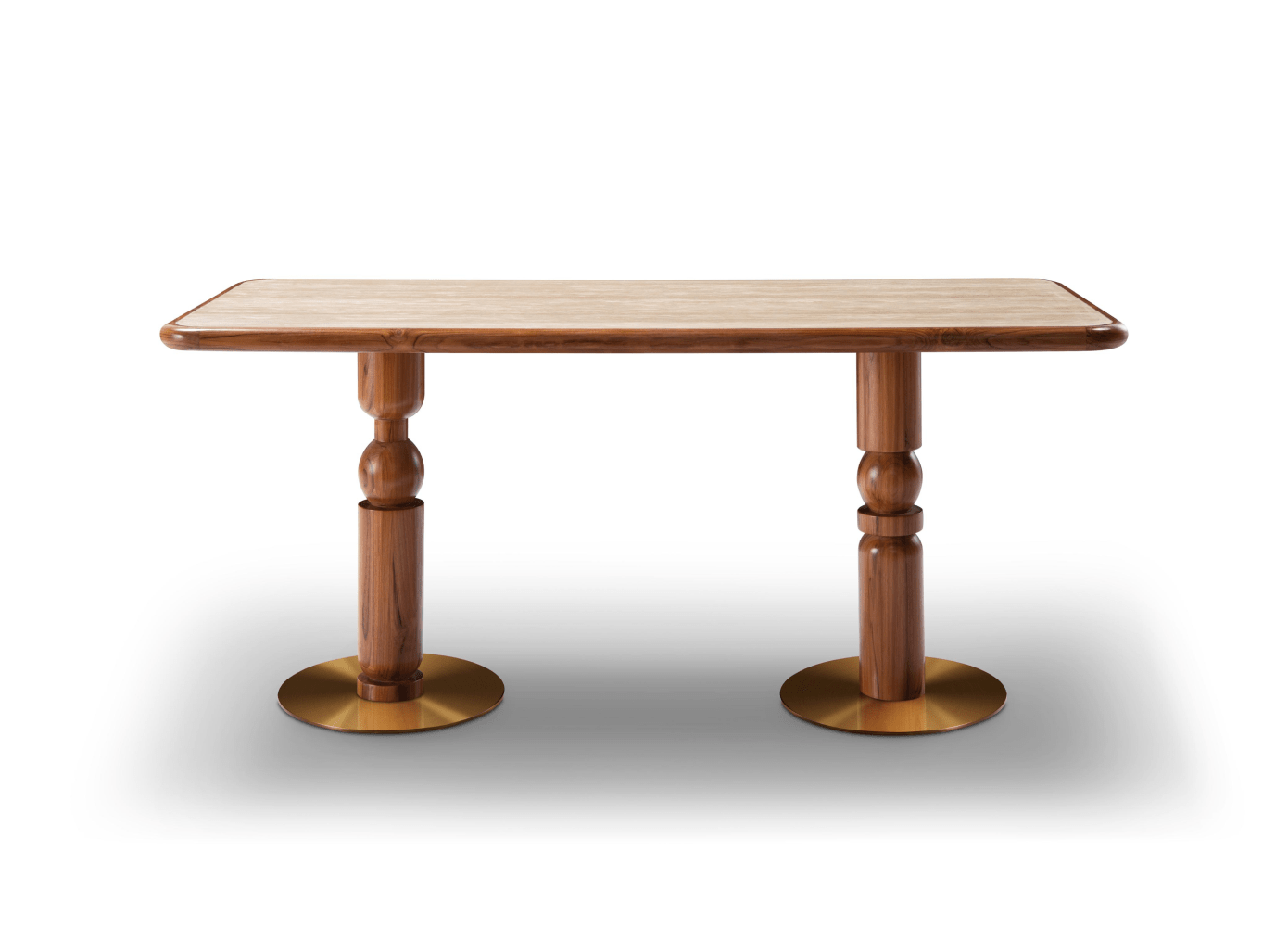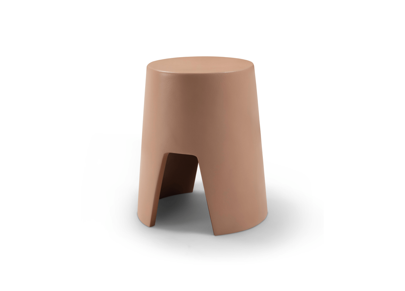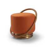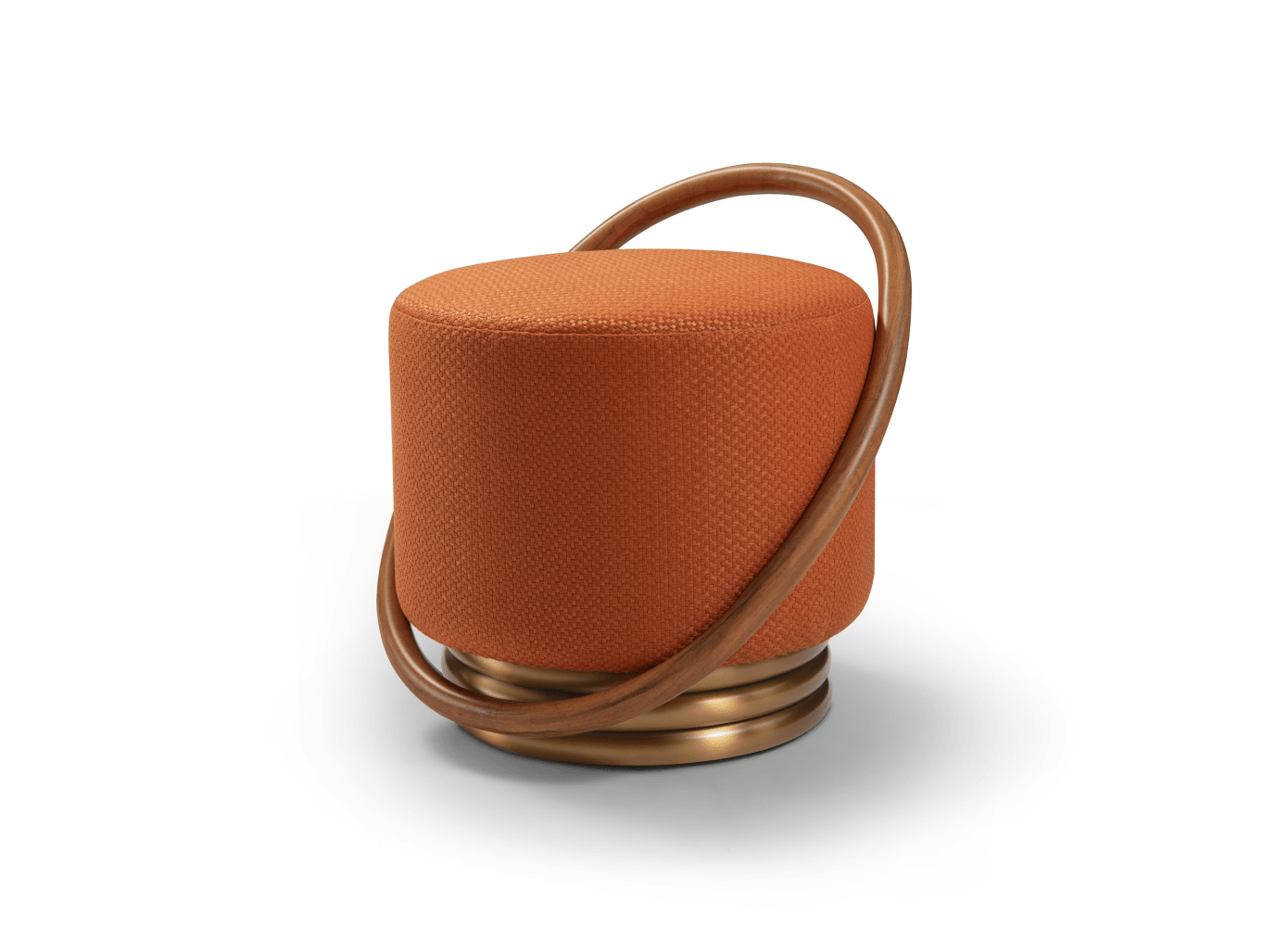 A custom pouf featuring a soft round seat, wooden wrap detail in teak, and a solid powder-coated metal base.