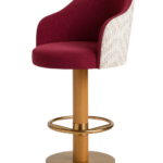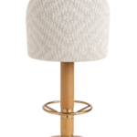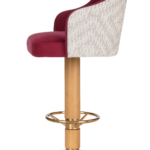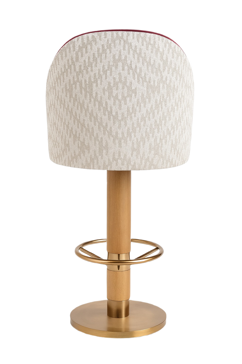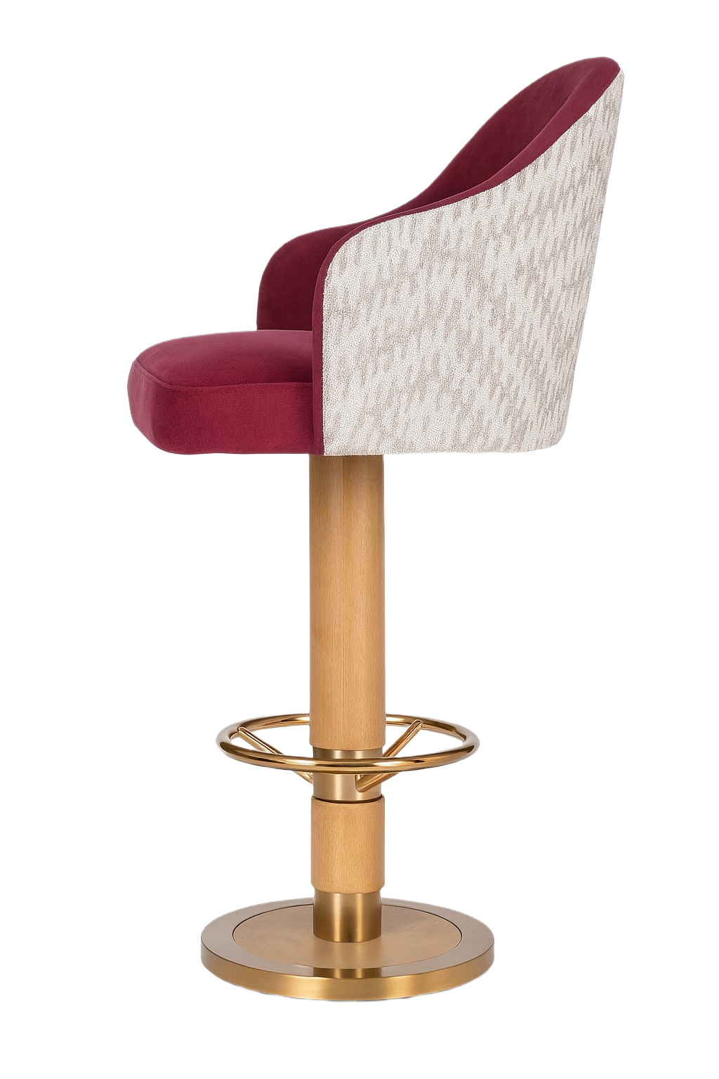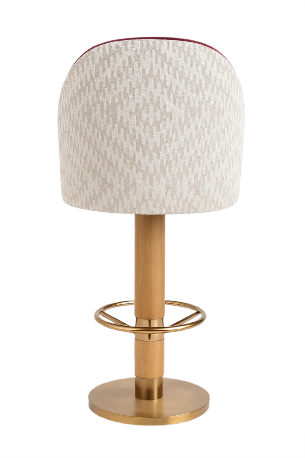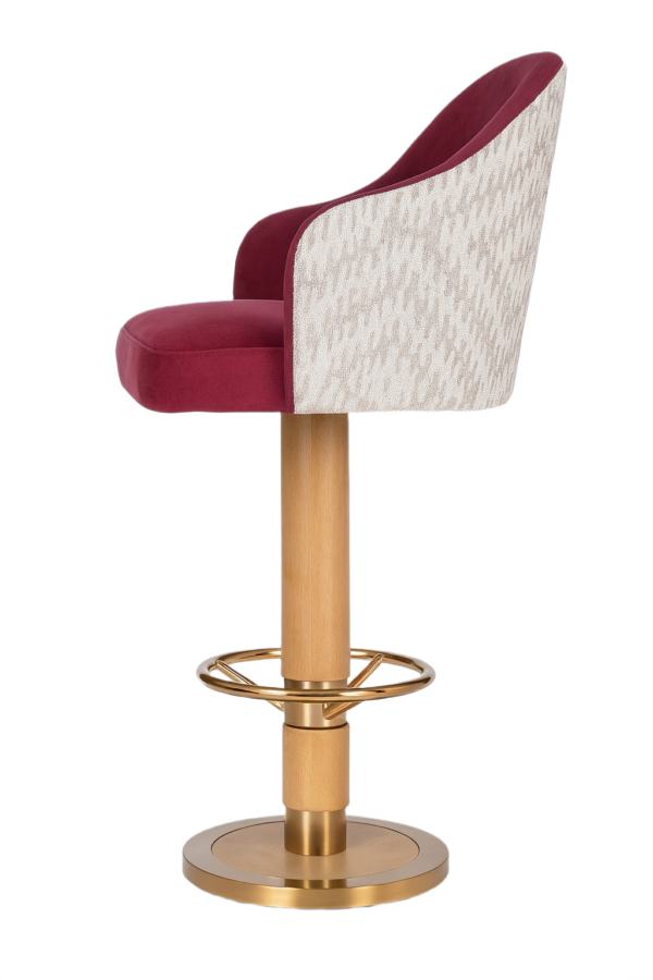 The front seat is upholstered in velvet, with the back in printed fabric for added character. The solid red oak column base is stained, and the stainless steel base plate and footrest feature an electroplated finish.