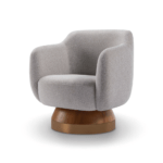 A custom-upholstered armchair with a smooth curved shell, set on a stained ash wood base with metal skirting.