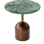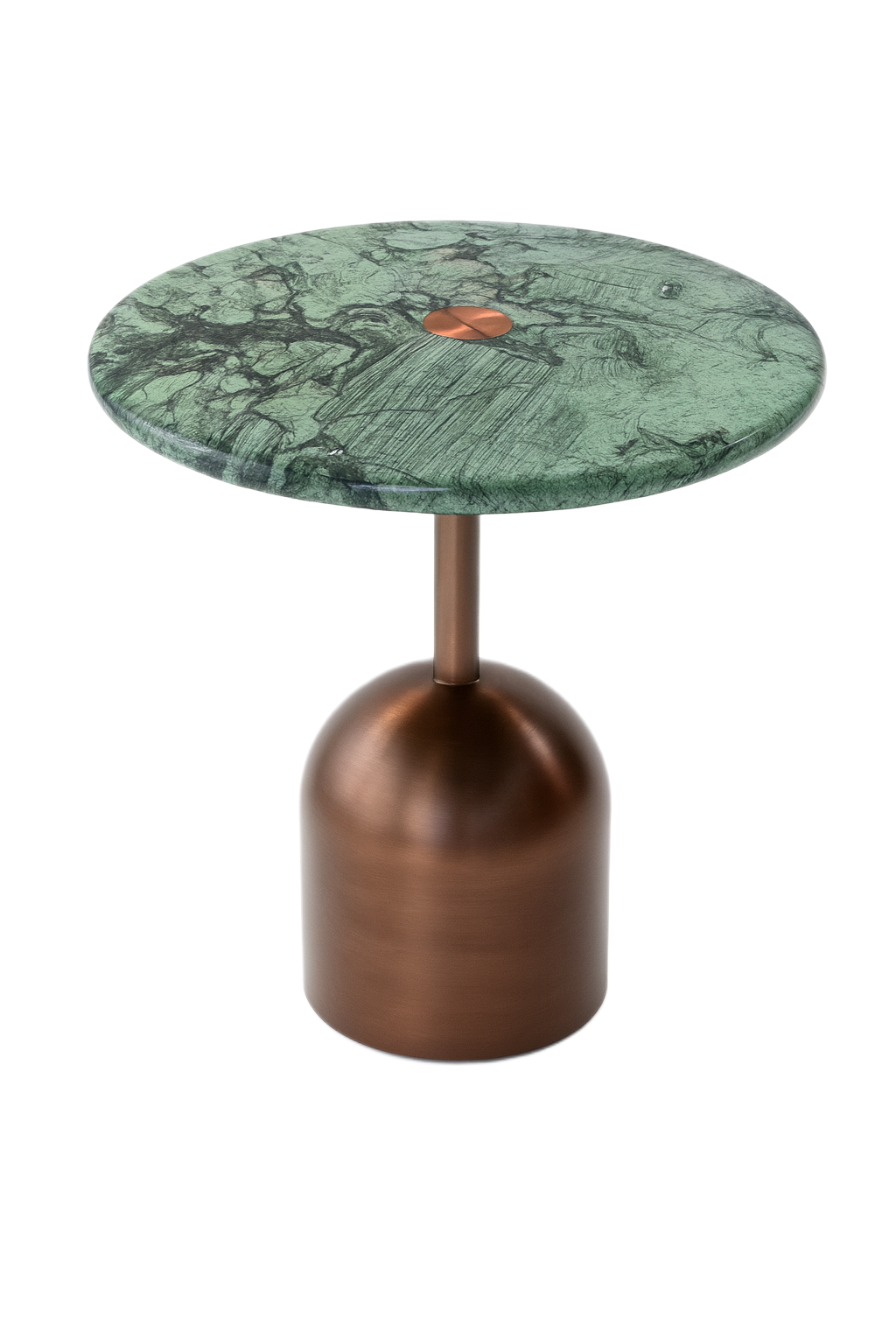20 mm thick Verde marble top, matched to the specified selection, paired with a patinated metal base for a refined, sculptural contrast.