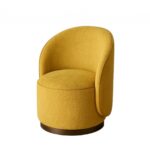 This custom chair is upholstered in a rich mustard fabric, finished with subtle piping for that tailored touch. The curved silhouette wraps around you, offering both comfort and character. Below, a stainless steel electroplated skirting adds a sleek metallic contrast. A great pick for lobbies, lounges, or anywhere that calls for a dose of charm.