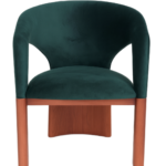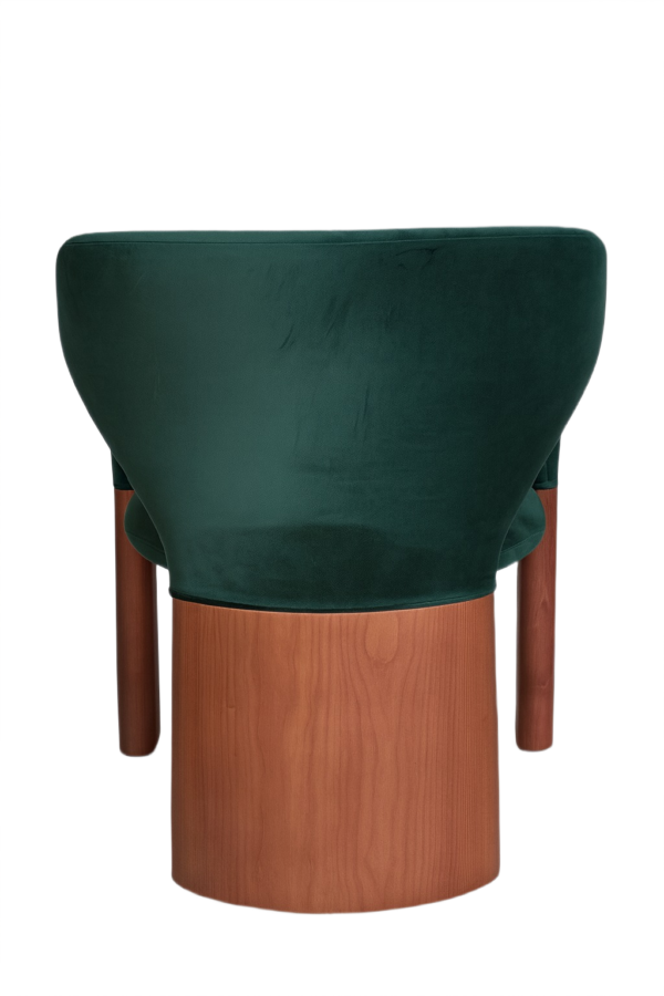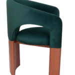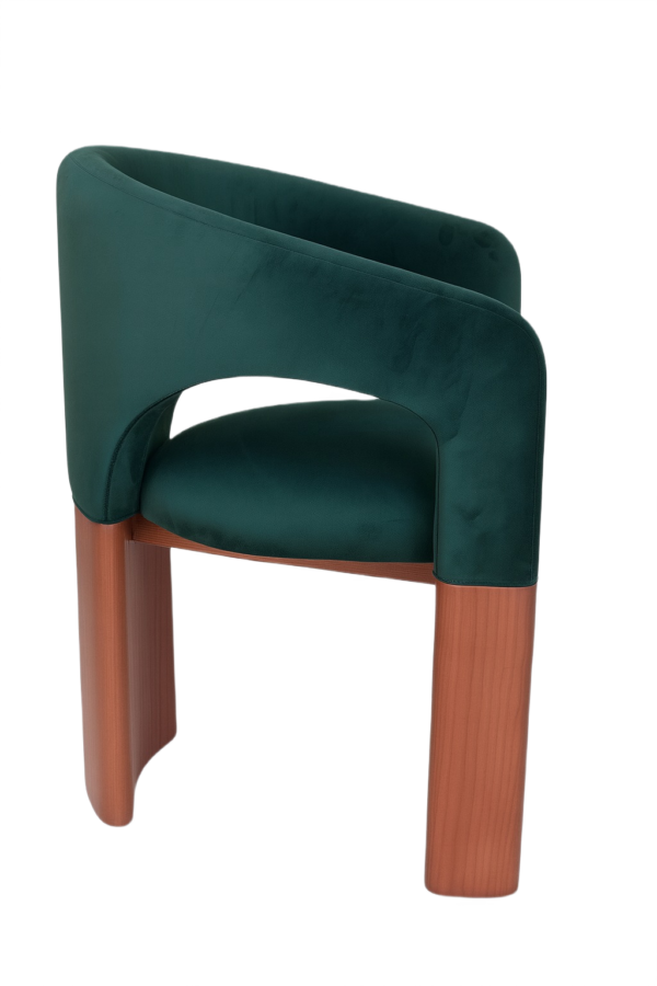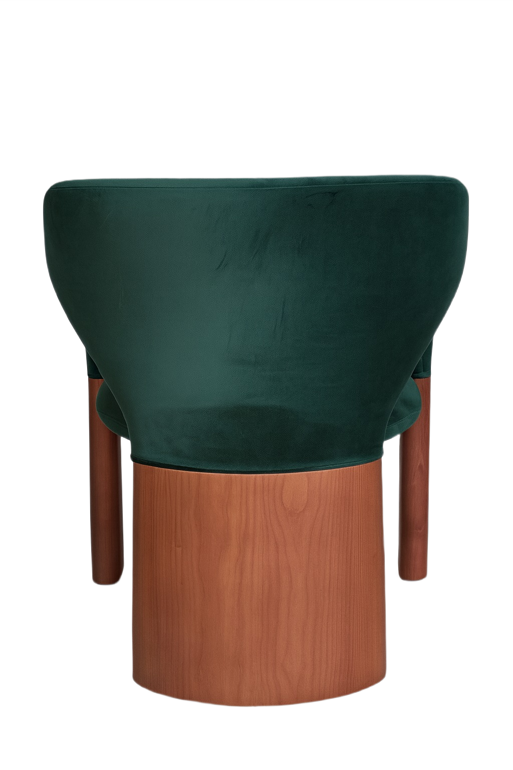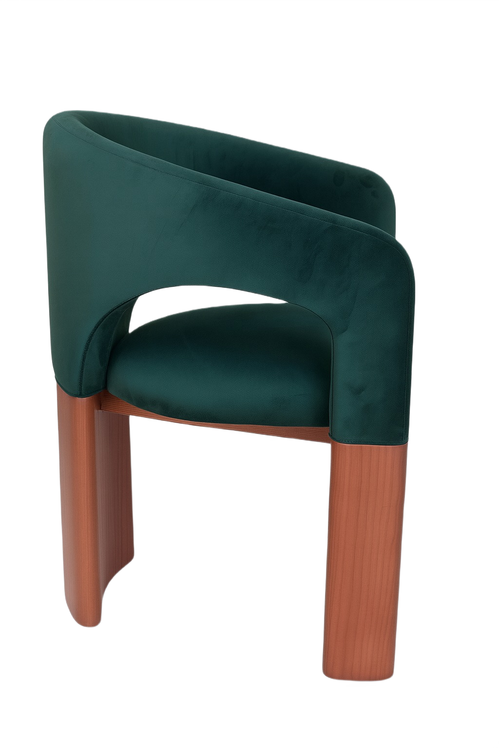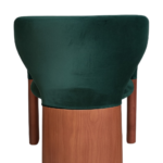 The frame is crafted from solid ash wood in a walnut-stained finish. The seat and back are upholstered in rich green velvet.