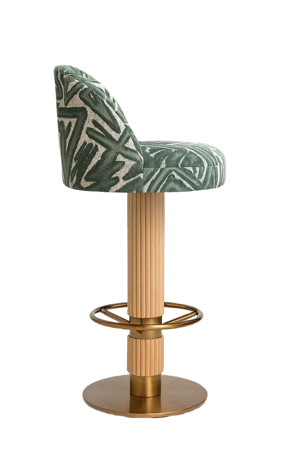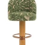 The seat and back are fully upholstered, supported by a solid red oak column base in a stained finish. The footrest and base plate are crafted in stainless steel with an electroplated coating.