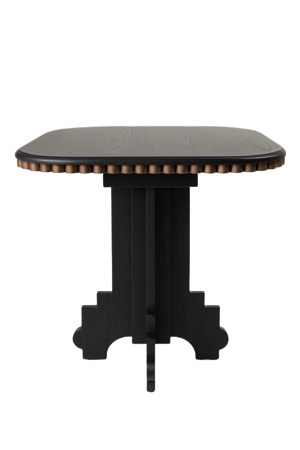 A 40 mm thick MDF tabletop with red oak veneer, stained in black and finished with a soft half-bullnose edge and gently rounded corners. A ribbed stainless steel electroplated detail sits beneath the top, adding a subtle architectural accent. The base is crafted from solid red oak wood in an open-grain, no-gloss black stain, and the table is completed with discreet glides for everyday ease.
