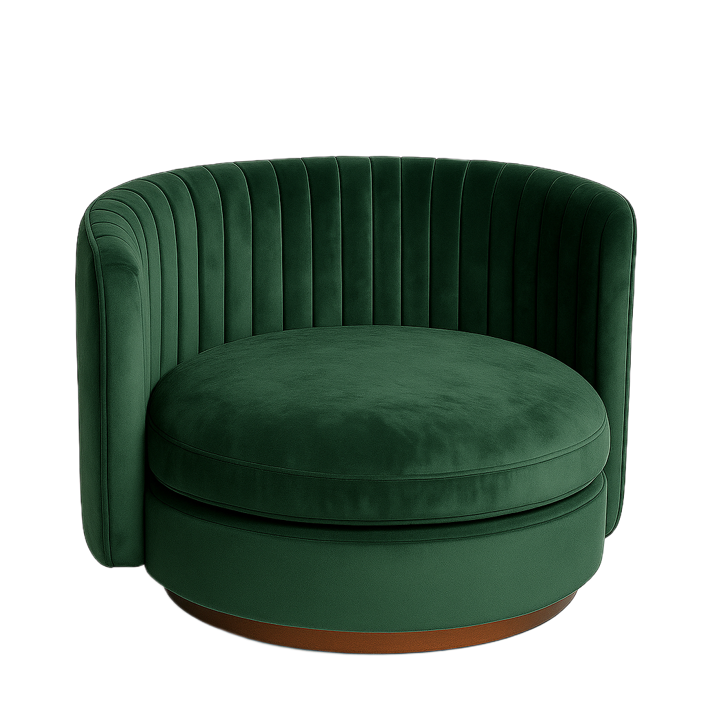 Fully upholstered in rich green velvet, finished with a walnut-stained wooden skirting.