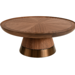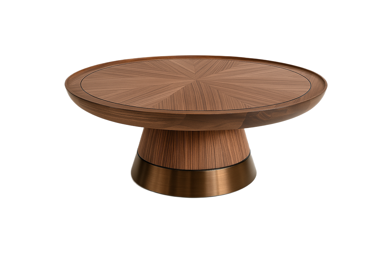 Walnut veneer top with a stained solid walnut wood base, finished with refined SS electroplated metal detailing.