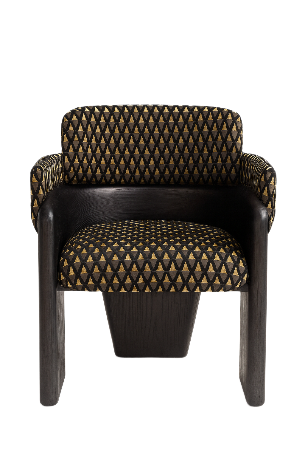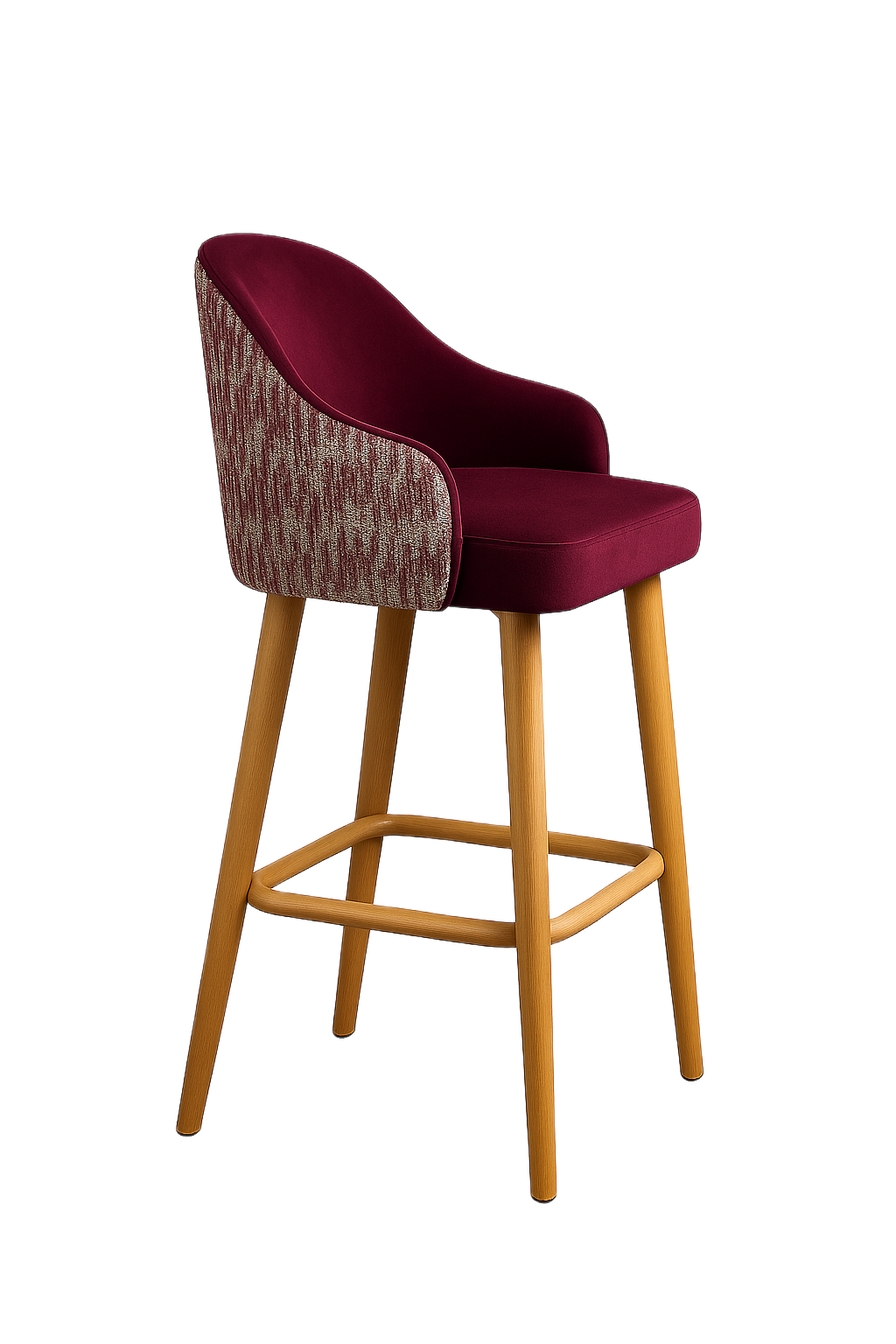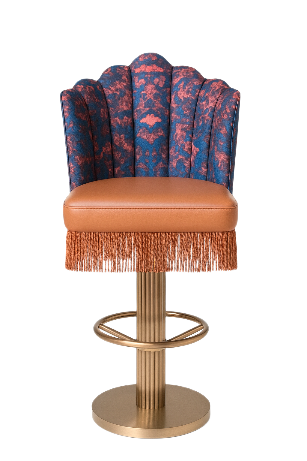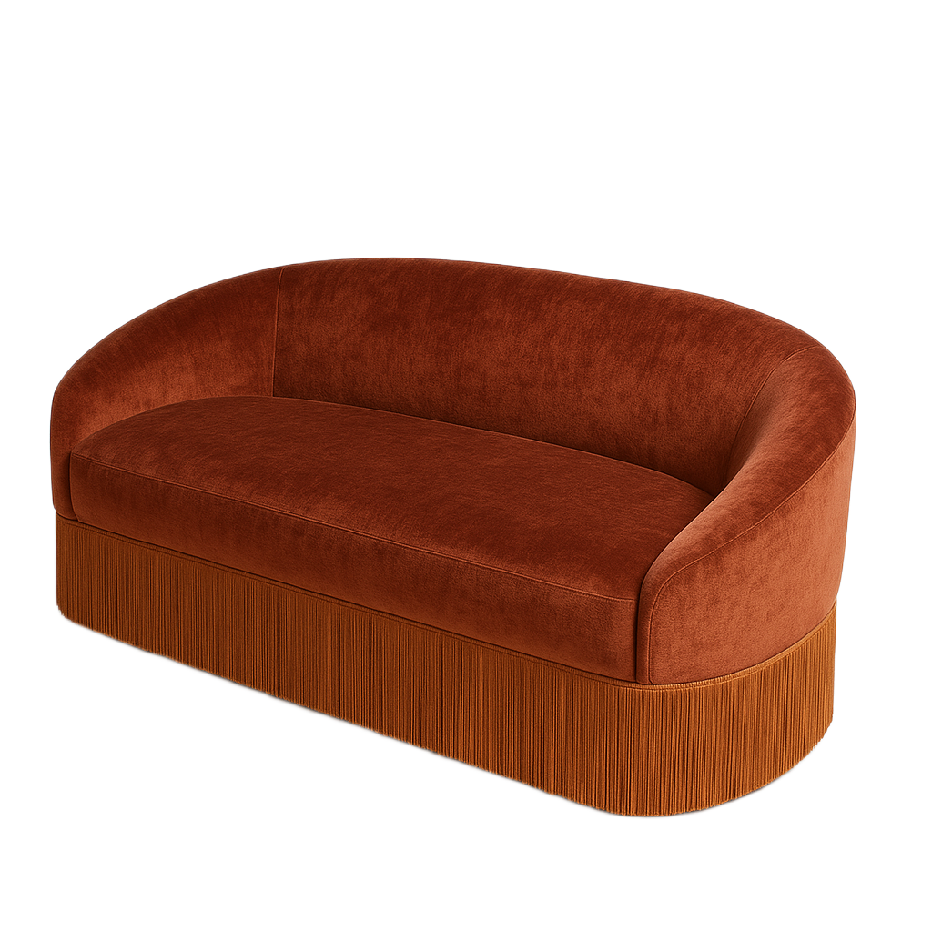 Seat and back upholstered in rich velvet with fringe detailing. Base in walnut-stained wood.