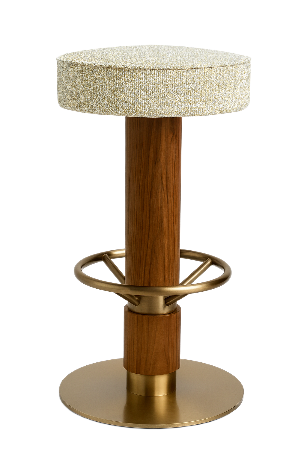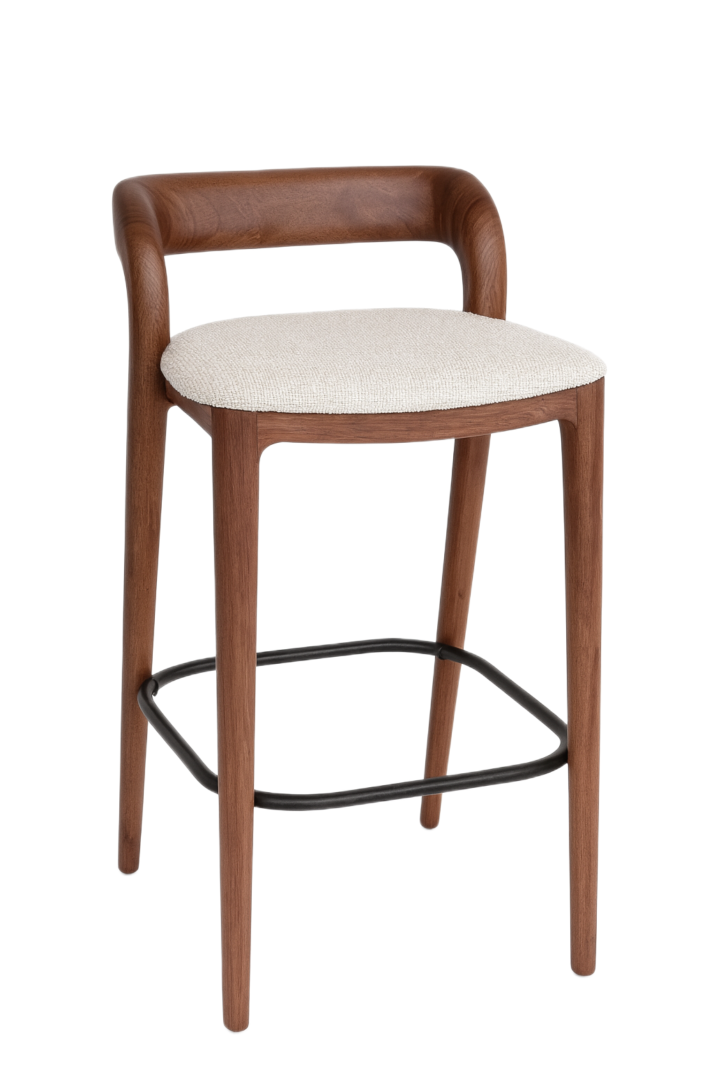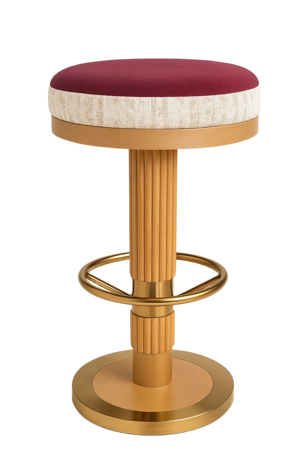 Seat and back upholstered in rich velvet with fringe detailing. Base in walnut-stained wood.