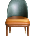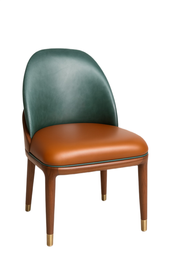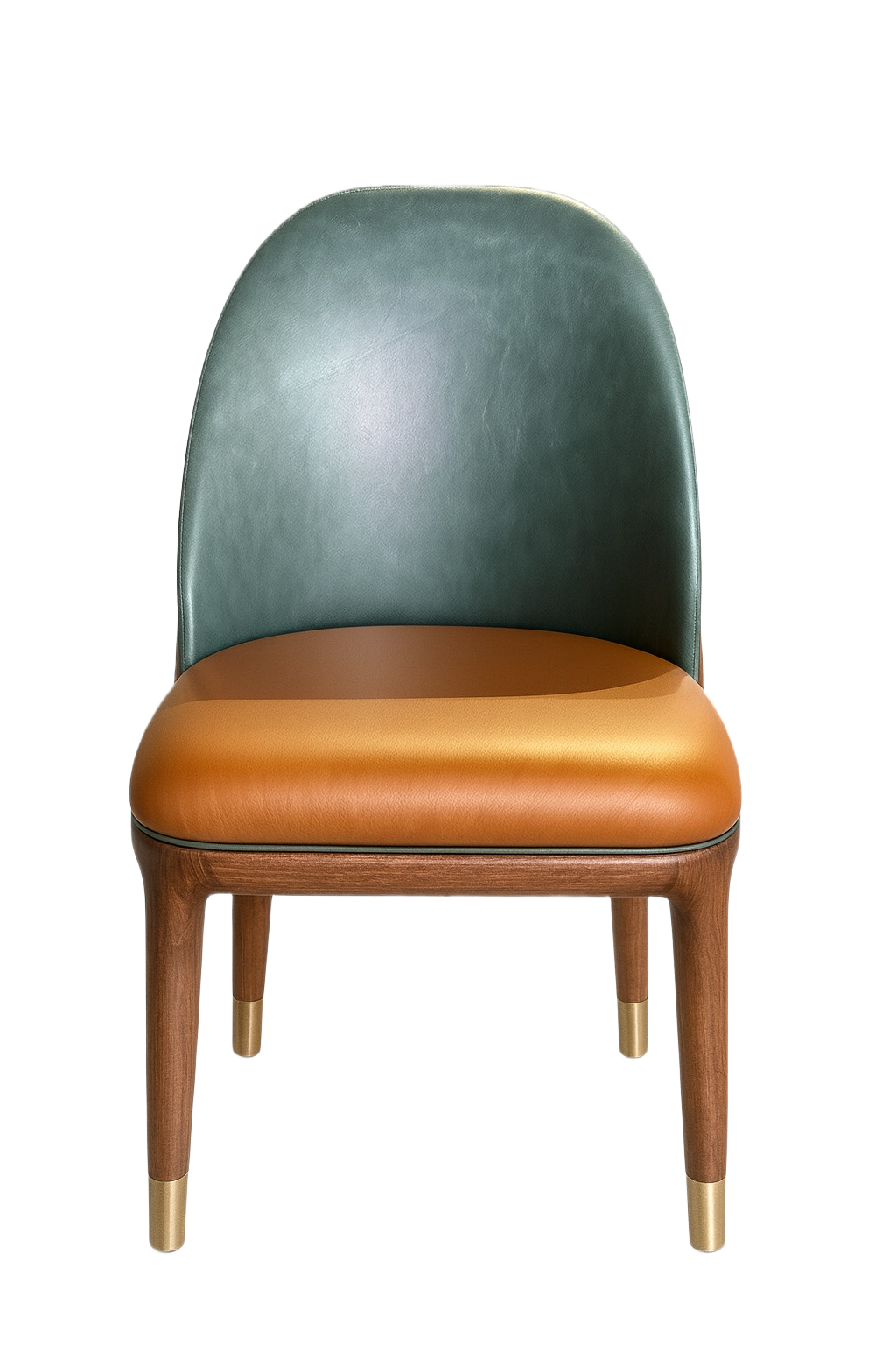 The seat and back are upholstered in real leather. The legs are crafted from stained solid walnut wood, finished with electroplated stainless steel leg caps and a matte brass back ring detail. Completed with glides.