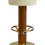 The column frame is crafted from solid teak wood with an oiled finish. The footrest and base plate are made of stainless steel with an electroplated coating. The seat is upholstered with 6 mm self-piping detail.
