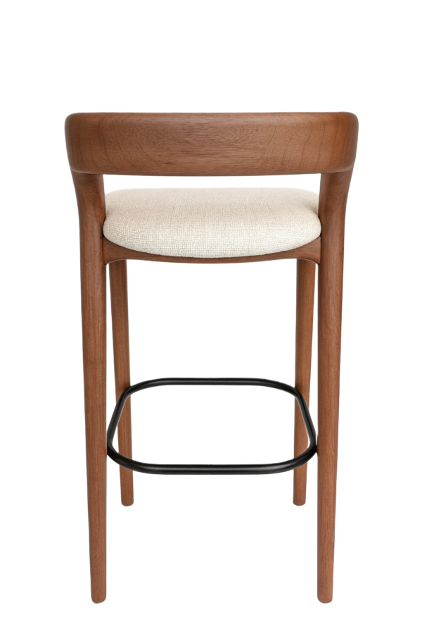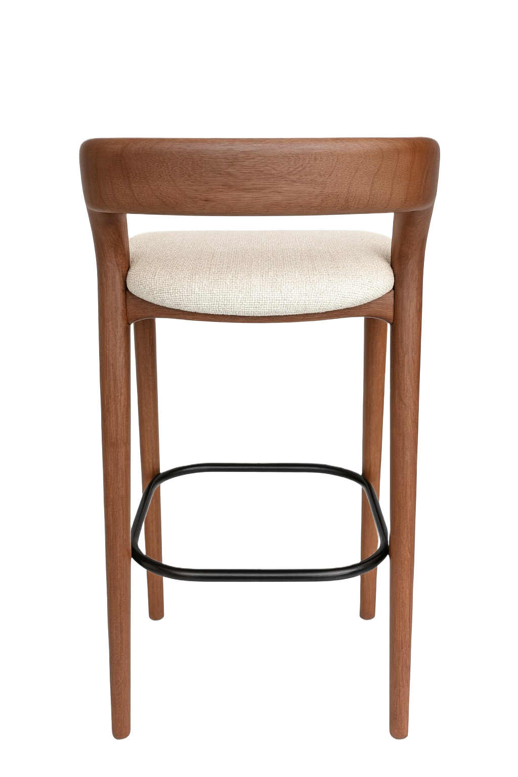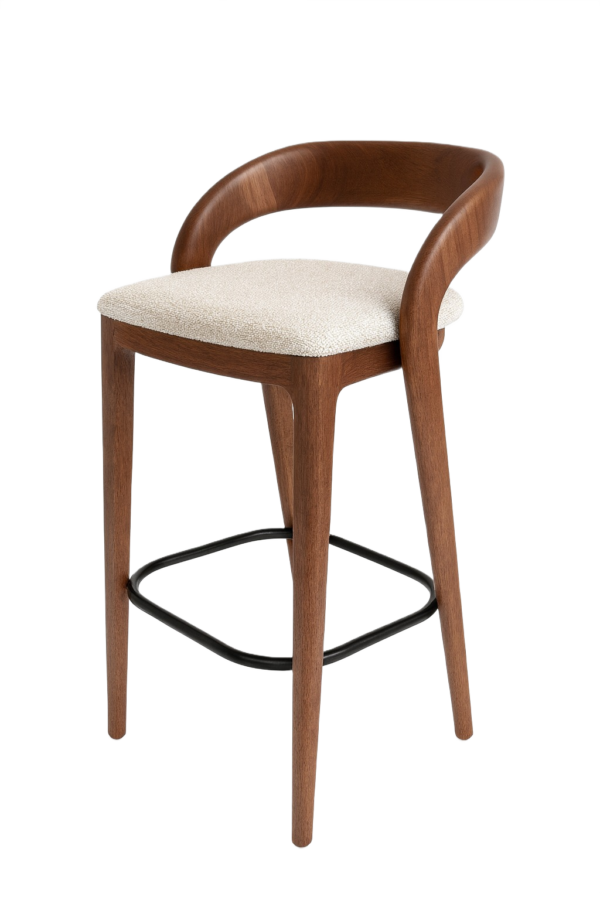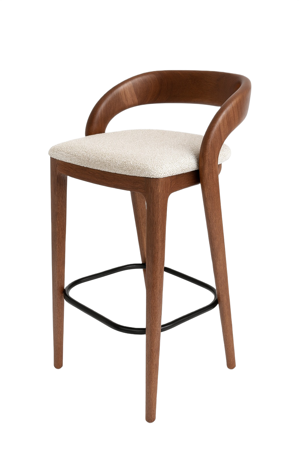 The frame is crafted from solid walnut wood in a stained finish. The footrest is made from MS with a powder-coated finish. The seat is upholstered.