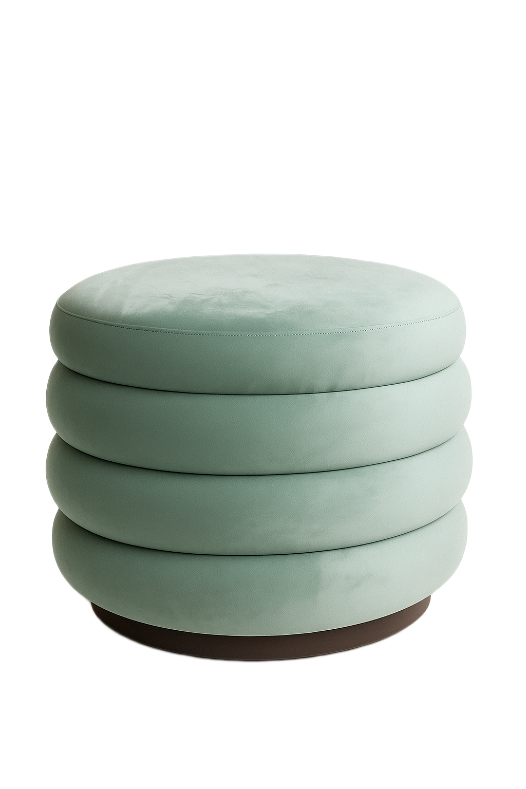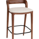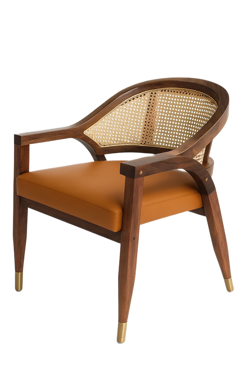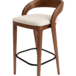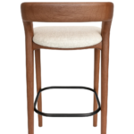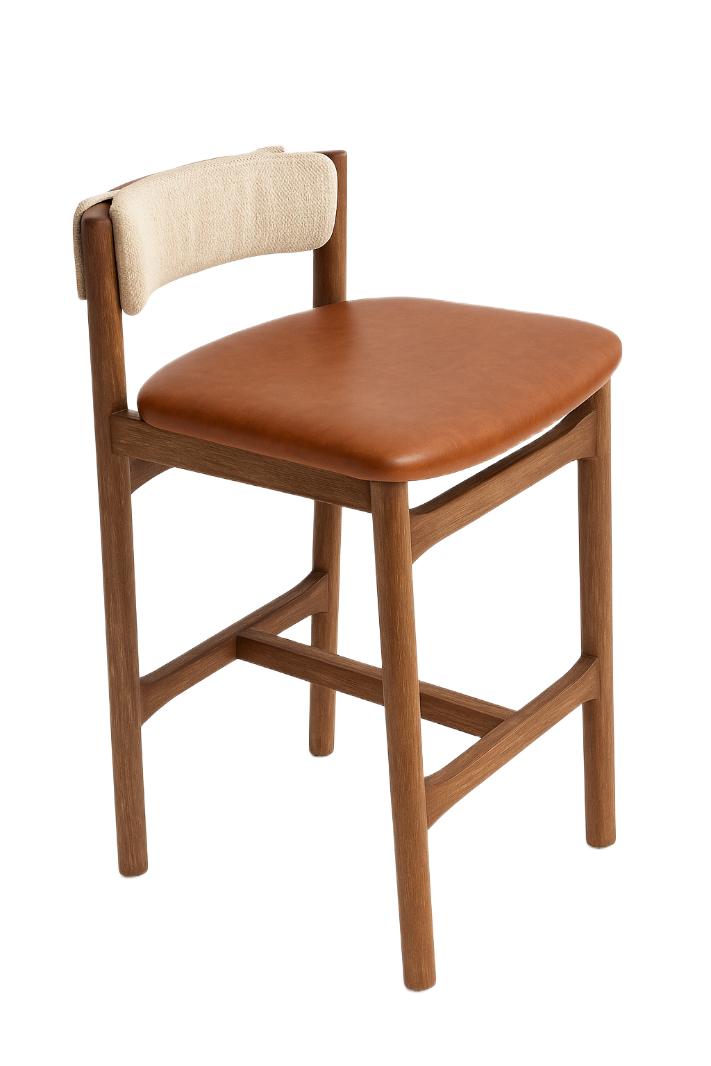 The frame is crafted from solid walnut wood in a stained finish. The footrest is made from MS with a powder-coated finish. The seat is upholstered.