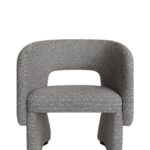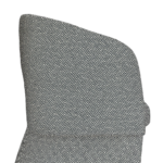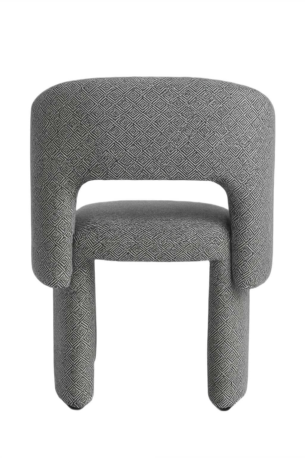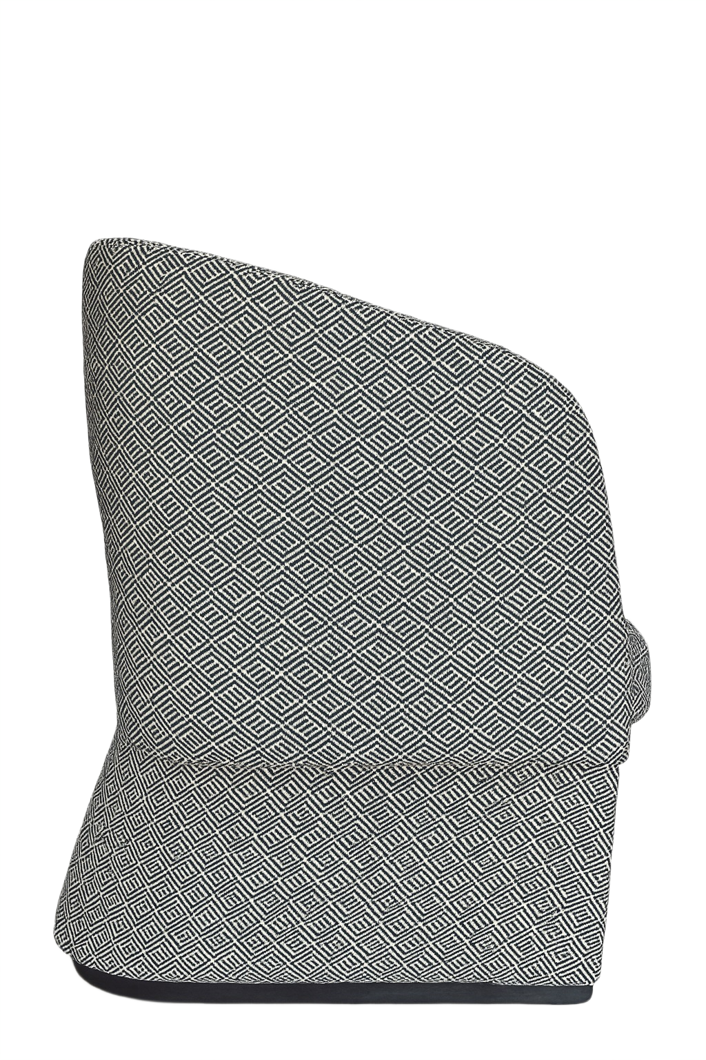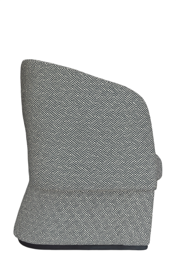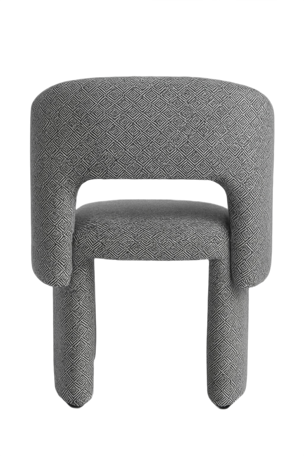 The dining armchair is fully upholstered in patterned fabric and finished with a skirting detail in stained solid South American teak wood. Completed with glides.